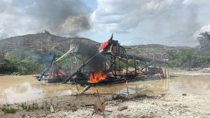 “Setibanya di lokasi, para pekerja PETI melarikan diri setelah mengetahui kedatangan petugas. Terhadap rakit-rakit PETI yang ditemukan, tim langsung melakukan tindakan tegas dengan cara merusak dan membakar seluruh rakit beserta peralatan yang digunakan, sehingga tidak dapat lagi dipergunakan,” jelasnya.